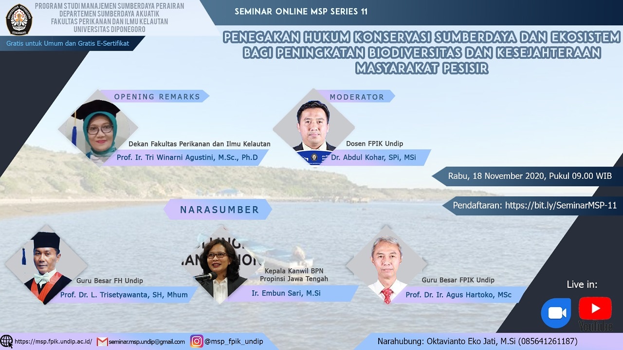 Program Studi Magister Manajemen Sumberdaya Perairan, Departemen Sumberdaya Akuatik, Fakultas Perikanan dan Ilmu Kelautan, Universitas Diponegoro menyelenggarakan Kuliah Umum Online MSP Series 11 dengan tema Penegakan Hukum Konservasi Sumberdaya dan Ekosistem Bagi Peningkatan Biodiversitas dan Kesejahteraan Masyarakat Pesisir yang dilaksanakan pada :