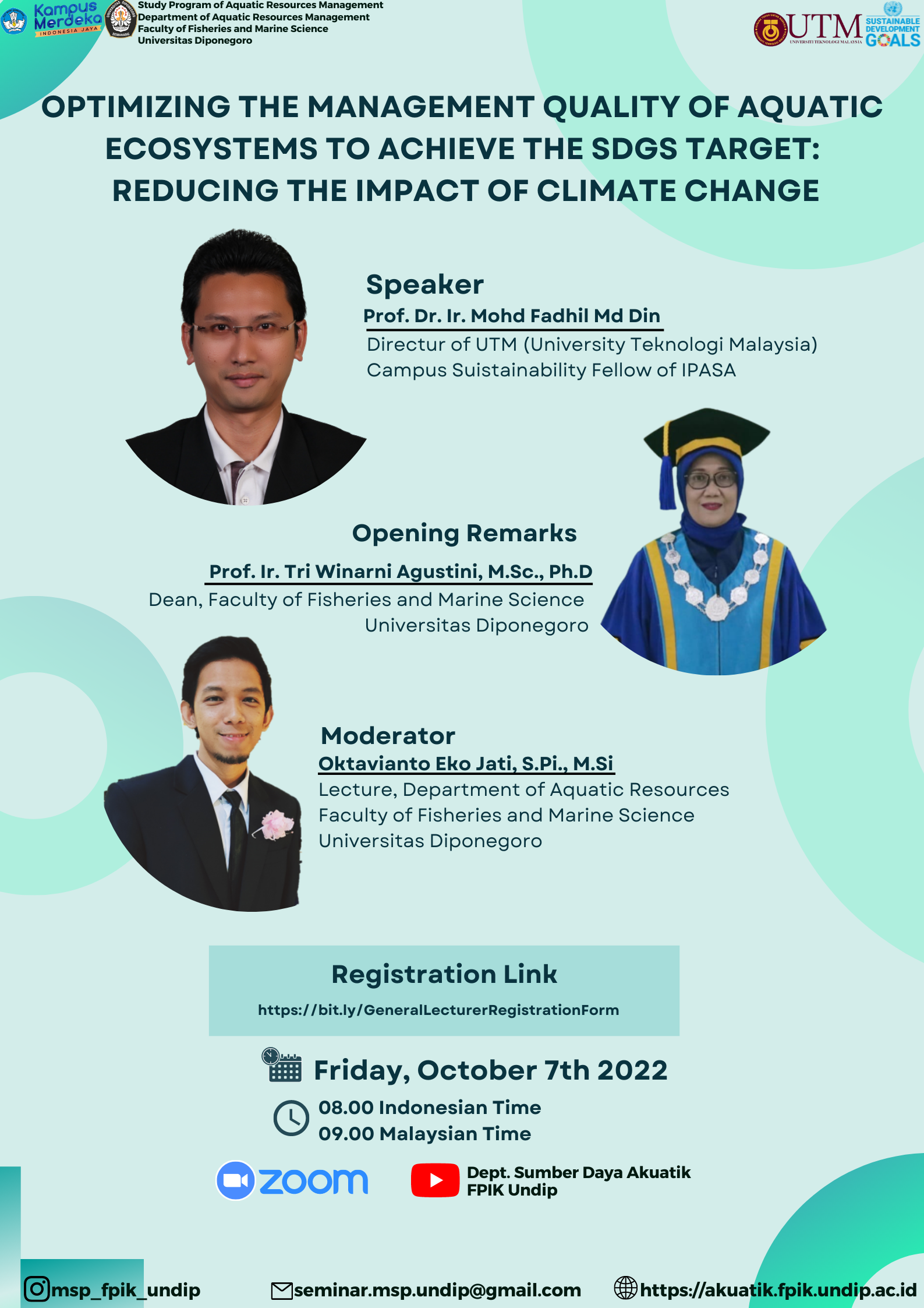 The Aquatic Resources Management Magister Study Program, Department of Aquatic Resources, FPIK, Undip held an Online Seminar on MSP with the theme of Reducing the impact of Climate Change to Achieve SDGs Target on Aquatic Resources Management Areas which are carried out on: