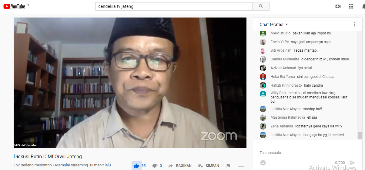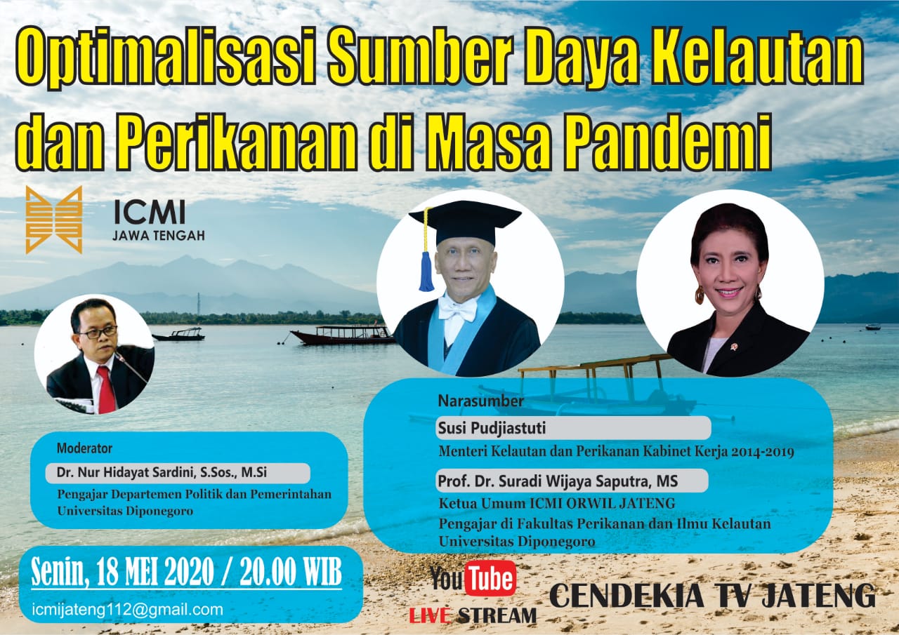 Senin, 18 Mei 2020. Telah diadakan diskusi yang membicarakan mengenai “Optimalisasi Sumberdaya Kelautan dan Perikanan di Masa Pandemi” dengan Narasumber Ibu Susi Pudjiastuti (Menteri Kelautan dan Perikanan th 2014-2019) dan Prof. Dr. Ir. Suradi Wijaya Saputra, MS (Guru Besar FPIK Undip). Diskusi ini diselenggarakan pada pukul 20.00WIB via Live Streaming YouTube di channel “Cendekia Tv Jateng”.