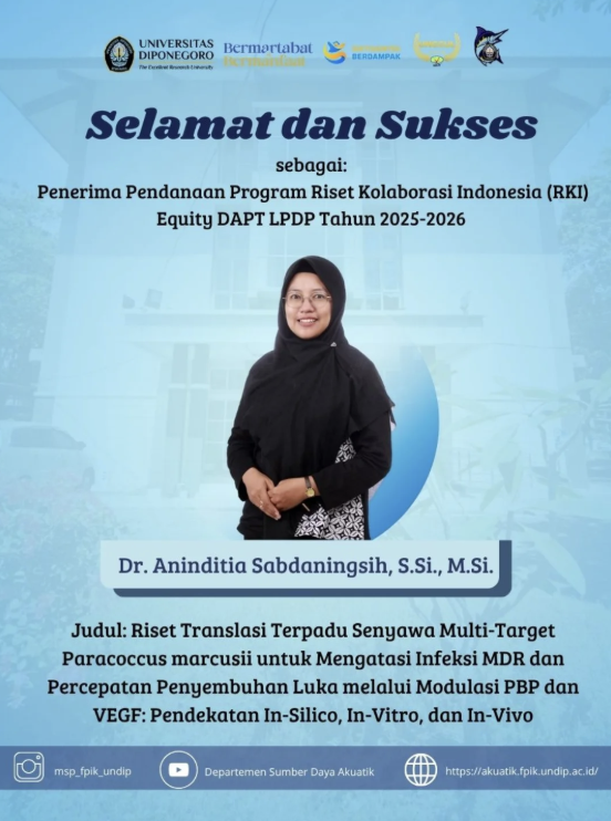 Semarang (12 November 2025) — Keluarga Besar Departemen Sumber Daya Akuatik, Fakultas Perikanan dan Ilmu Kelautan (FPIK), Universitas Diponegoro, menyampaikan apresiasi dan kebanggaan atas pencapaian luar biasa yang diraih oleh Dr. Aninditia Sabdaningsih, S.Si., M.Si. Dosen sekaligus peneliti di lingkungan FPIK Undip ini resmi menjadi Penerima Pendanaan Program Riset Kolaborasi Indonesia (RKI) Equity DAPT LPDP Tahun 2025–2026.