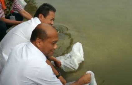 Gunungpati, Semarang (24 September 2022) – The Indonesian Minister of Maritime Affairs and Fisheries, Sakti Wahyu Trenggono with the Dean of FPIK Undip, Prof. Ir. Tri Winarni Agustini M.Sc, Ph.D. and Deputy Chancellor I Undip, Prof. Faisal, S.E., M.Sc., Ph.D. has carried out a fish restocking activity in the Jatibarang Reservoir on Tuesday, September 20, 2022. Approximately one hundred and fifty thousand seeds of nilem and tawes were stocked as a form of support from the Provincial Marine and Fisheries Service Central Java, Semarang City Fisheries Service, and Sukabumi Fish Seed Center (BBI). Jatibarang Reservoir is located in the tourist village of Jamalsari, Kandri sub-district, Gunungpati, which is a fostered village of the Water Resources Management Study Program of the Department of Aquatic Resources, FPIK Undip.