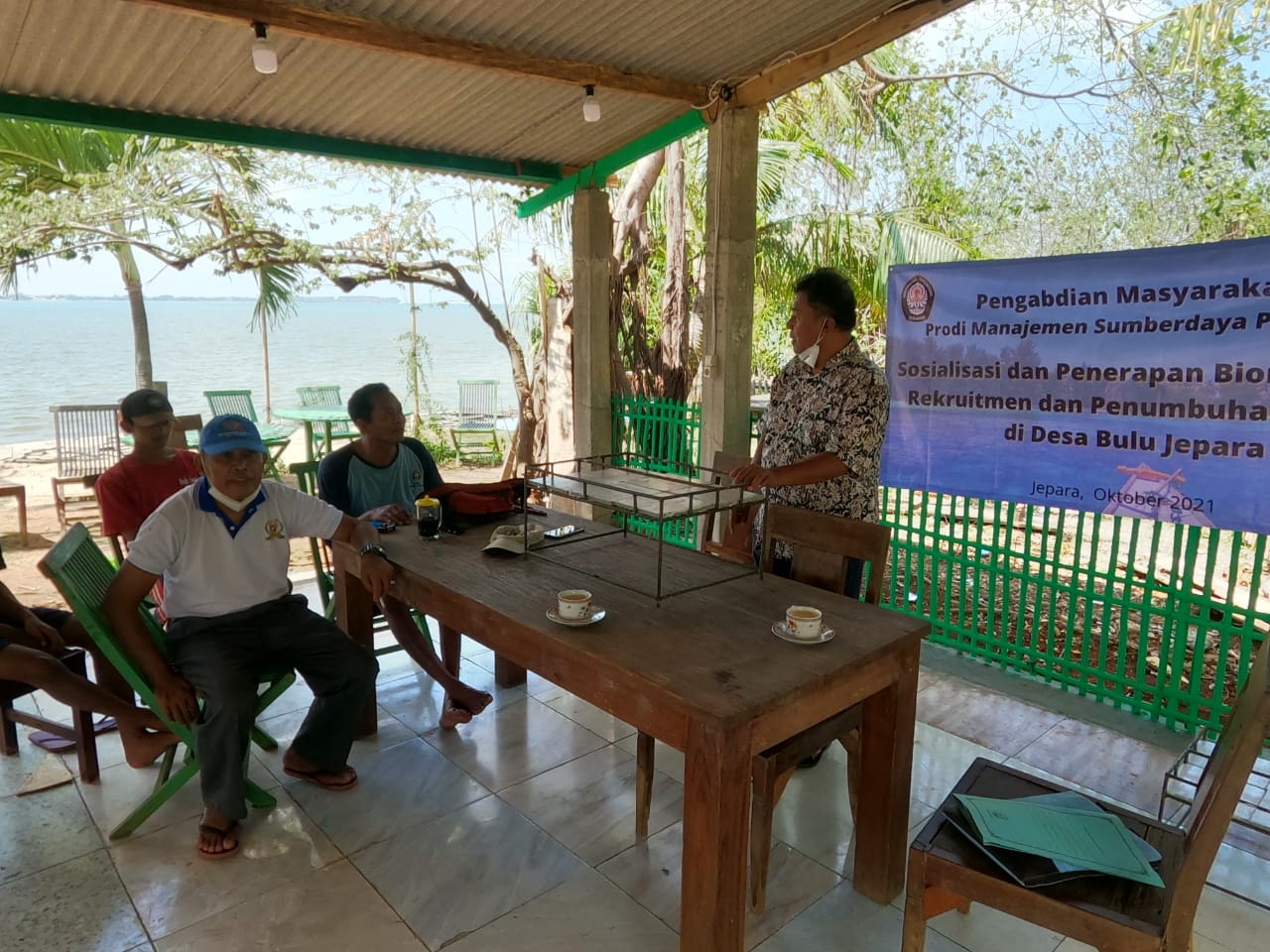Coastal ecosystem in Bulu Jepara Village. Jepara District, Jepara Regency is a unique ecosystem and is dominated by many types of seagrass and coral reef ecosystems. This ecosystem can contribute to the productivity of biological resources and increase the diversity of high biological resources. However, based on the passage of time, the coastal ecosystem in the Bulu Village area has experienced a lot of degradation due to various activities on the land, such as the opening of ponds, construction of resorts and settlements and the use of mooring fishing boats around. Kartini Beach waters area, apart from having great potential in supporting marine tourism activities, it also has the potential to experience degradation of its ecosystem. Therefore, it is necessary to understand conservation activities such as by implementing Biorock.