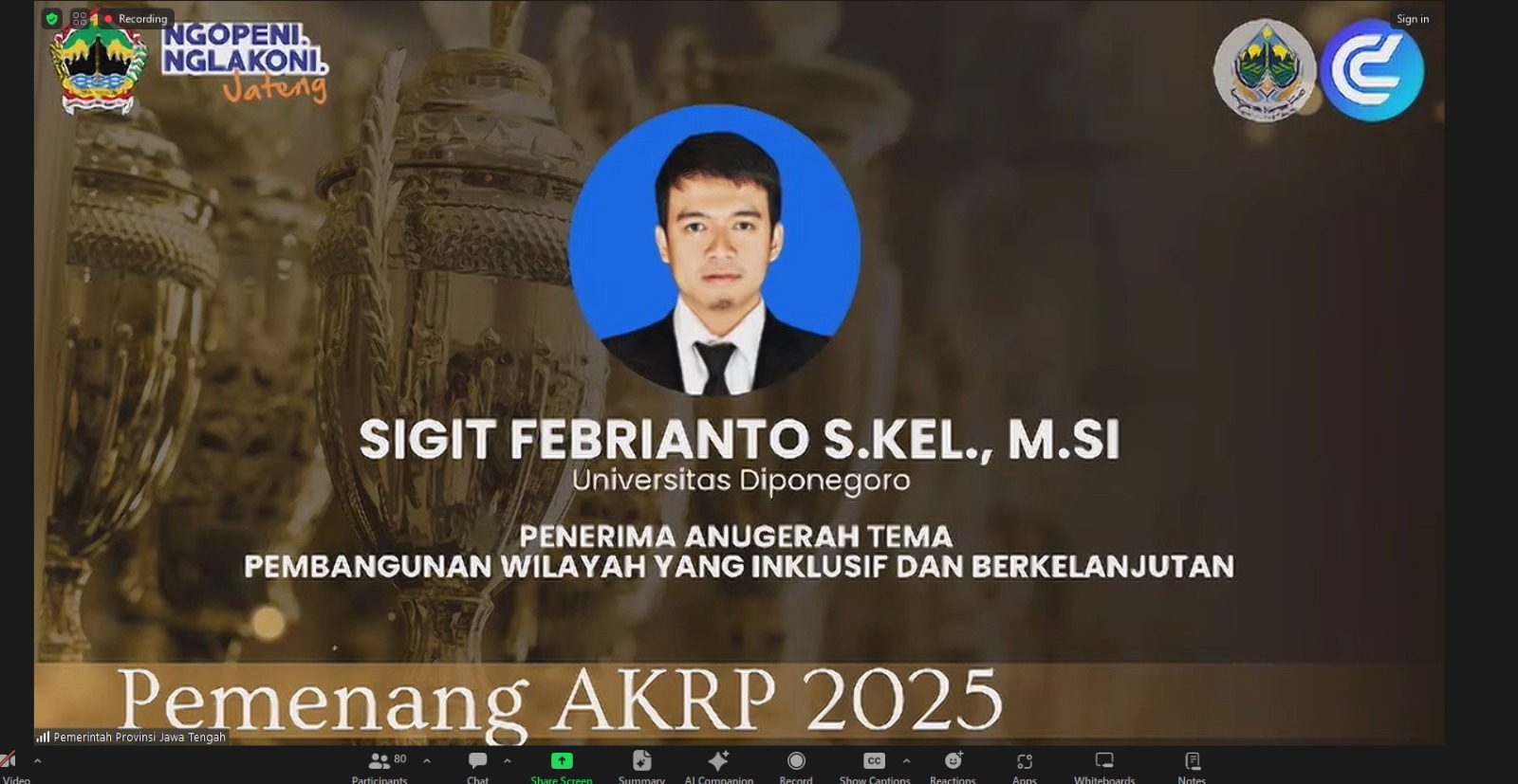 Semarang (10 November 2025) – Diponegoro University (Undip) has once again made a proud achievement through the 2025 Central Java Development Research Award event organised by the Regional Research and Innovation Agency (BRIDA) of Central Java Province. One of the recipients of the award is Sigit Febrianto, S.Kel., M.Si., a lecturer in the Undergraduate Programme in Water Resources Management, Faculty of Fisheries and Marine Sciences (FPIK) at Undip.