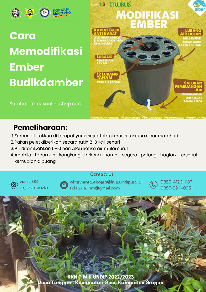 TIM II Kuliah Kerja Nyata (KKN) Universitas Diponegoro Kabupaten Sragen di bawah bimbingan Dosen Bapak Oktavianto Eko Jati, S.Pi., M.Si melaksanakan program kerja pengenalan “Budikdamber” atau Budidaya Ikan dalam Ember. Kegiatan tersebut diikuti oleh warga RT 07 Desa Tanggan, Kecamatan Gesi, pada Kamis (3/8).
