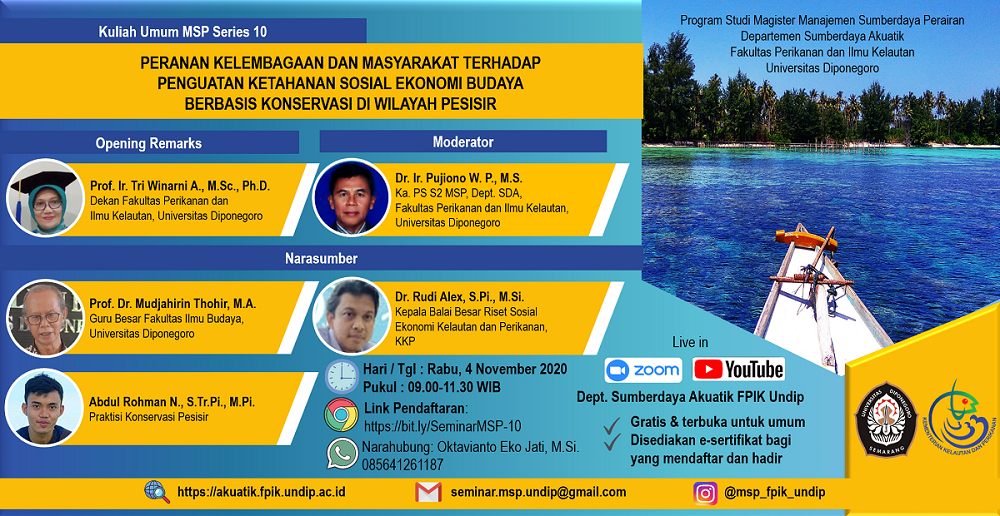Program Studi Magister Manajemen Sumberdaya Perairan, Departemen Sumberdaya Akuatik, Fakultas Perikanan dan Ilmu Kelautan, Universitas Diponegoro menyelenggarakan Kuliah Umum Online MSP Series 10 dengan tema Peranan Kelembagaan dan Masyarakat Terhadap Penguatan Ketahanan Sosial Ekonomi Budaya Berbasis Konservasi di Wilayah Pesisir yang dilaksanakan pada :