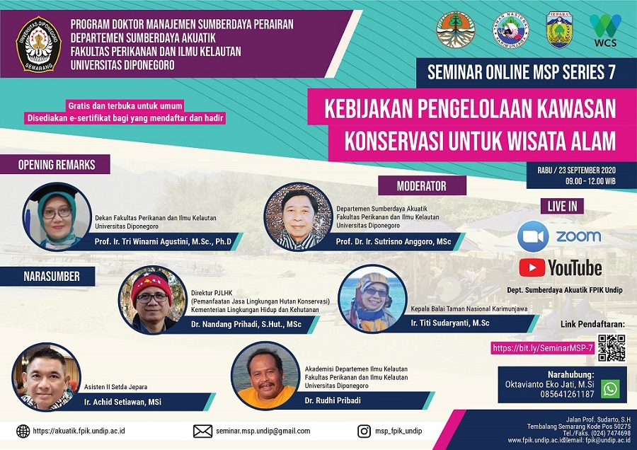 Program Studi Doktor Manajemen Sumberdaya Perairan, Departemen Sumberdaya Akuatik, FPIK, Undip menyelenggarakan Seminar Online MSP Series 7 dengan tema Kebijakan Pengelolaan Kawasan Konservasi untuk Wisata Alam yang dilaksanakan pada